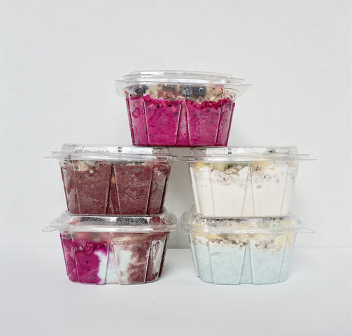 Our acai, pitaya, mango, and coconut blends are great on their own, but taste even better with toppings. Choose from a variety of fresh fruits, granola, all natural peanut/ almond butter, unsweetened shreds, raw cacao nibs, organic blue agave, and honey! Our bowls are served fresh and made to be stored in the freezer. Save more with this bundle pack deal!