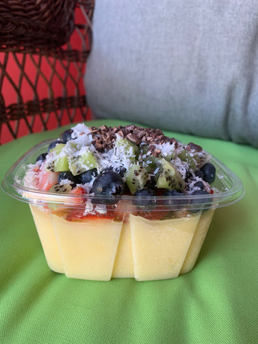Toppings: Strawberries, Blueberries, Kiwi, Coconut Shreds, and Cacao Nibs